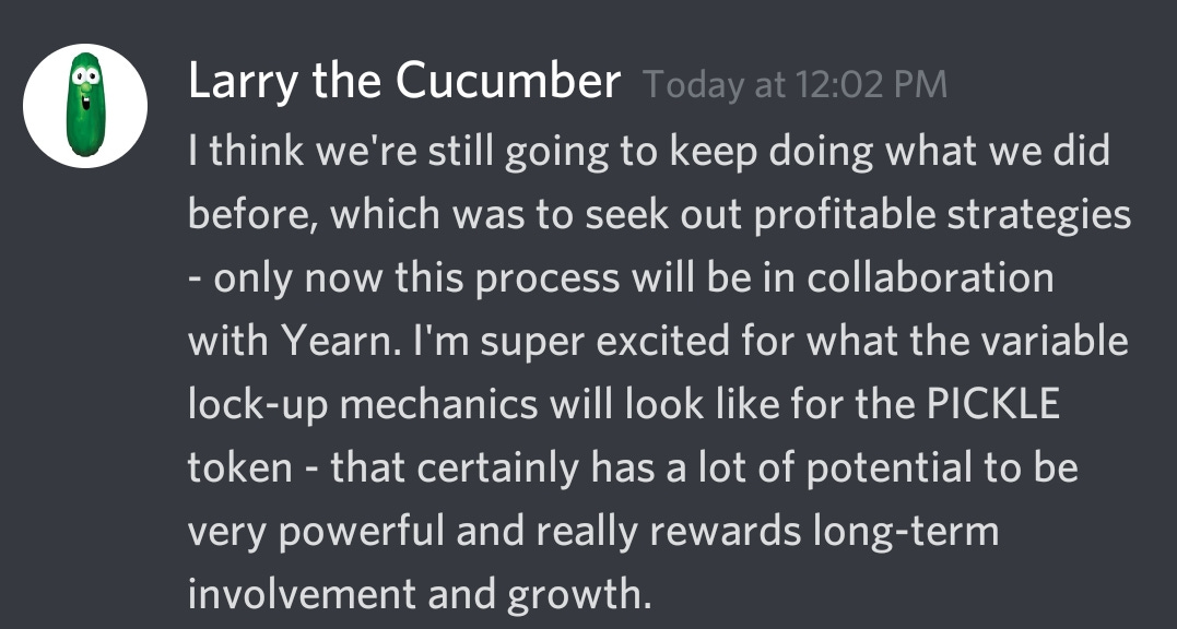 5) Let's talk about the Pickle roadmap. Obviously a lot has changed with the Yearn news, but as I see it there's now huge potential for growth, both for Total Value Locked and Pickle token growth (4 year lockups for rewards boosts etc). What are you thoughts?
