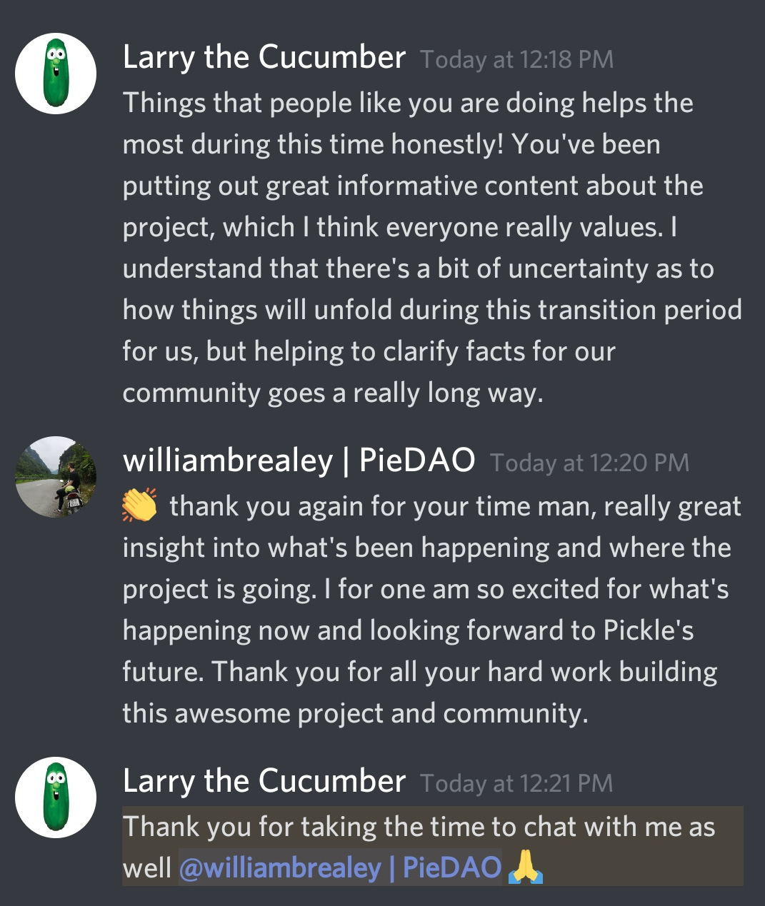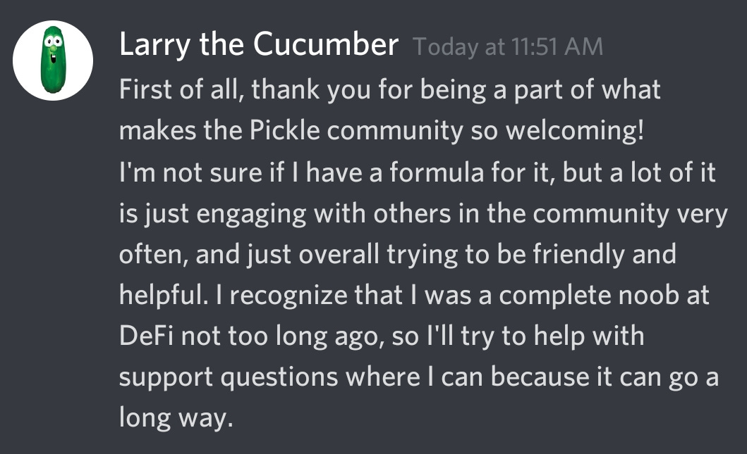 8) Thanks for taking the time today! Final question, we saw how creative the community is with the Pickle challenge with users submitting their memes and content, and people are really keen to help out more. What's your suggestion for people who want to help the project grow?
