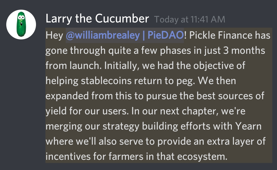 That’s all for today everyone. If you’re interested in learning more about Pickle and their integration with Yearn head on over to the community Discord.