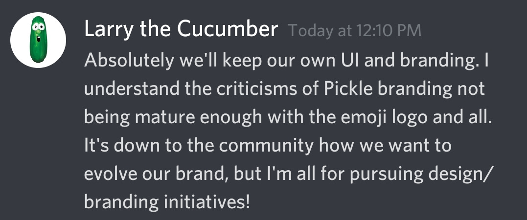 7) We know that Pickle jars are going to be available as Yearn vaults, but will you guys keep your own UI and jar branding? Some have criticised the Pickle branding as not mature enough, what are your thoughts on it now? Would you move away from the emoji logo to something more professional, as Sushi has done?